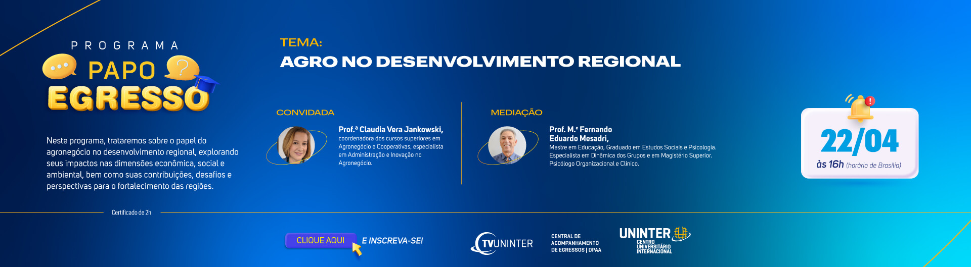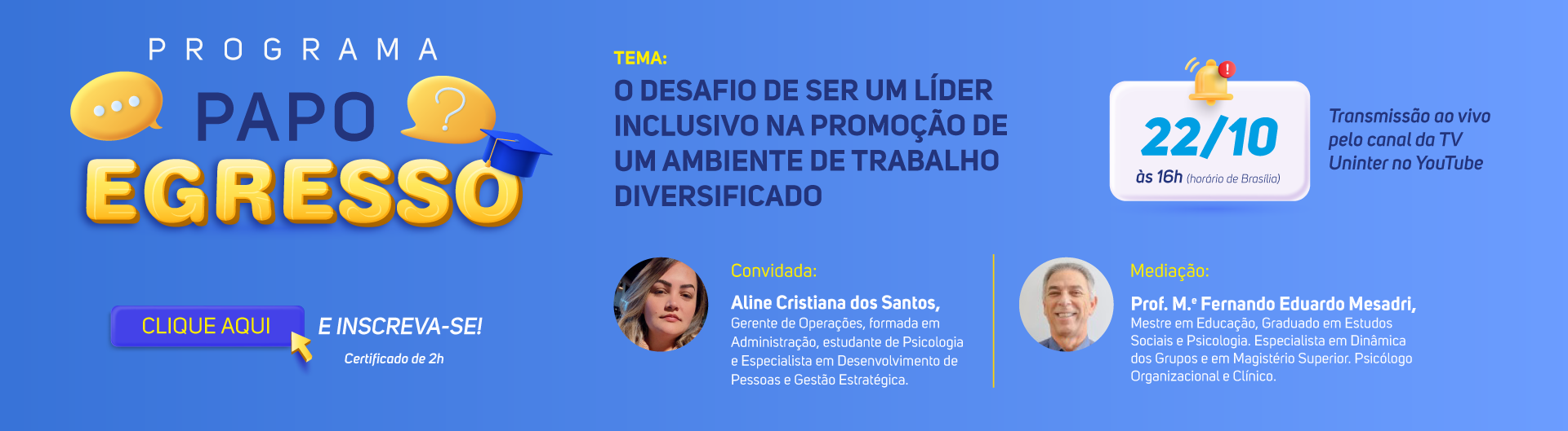 Consideram-se egressos todos os estudantes que concluíram integralmente um curso no Centro Universitário Internacional UNINTER, abrangendo os cursos da EJA (Educação de Jovens e Adultos), os cursos técnicos, os cursos de graduação — incluindo bacharelado, licenciatura e tecnólogo —, bem como os cursos de pós-graduação, compreendendo tanto os programas lato sensu (especialização) quanto stricto sensu (mestrado e doutorado).