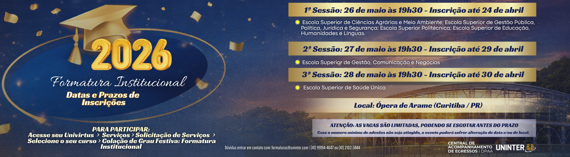 Consideram-se alunos UNINTER todos os estudantes devidamente matriculados, abrangendo os cursos da EJA (Educação de Jovens e Adultos), Técnico, Graduação, Pós-Graduação lato sensu (especialização) e stricto sensu (mestrado e doutorado), em todas as modalidades de ensino.